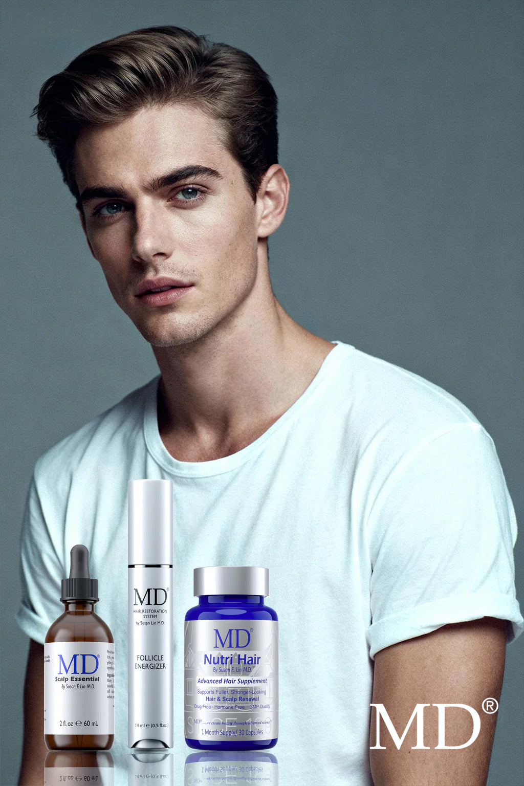 The set includes three simple steps: • Step 1: MD Scalp Essential — Apply once daily to a clean, dry scalp to exfoliate, balance oil, and energize follicles. • Step 2: MD Follicle Energizer — Apply once daily to thinning or shedding areas using the precision applicator. This serum helps activate follicles and stimulate new hair growth. • Step 3: MD Nutri Hair — Take one capsule daily to nourish your hair from within, promoting thicker, shinier hair and restoring fullness.