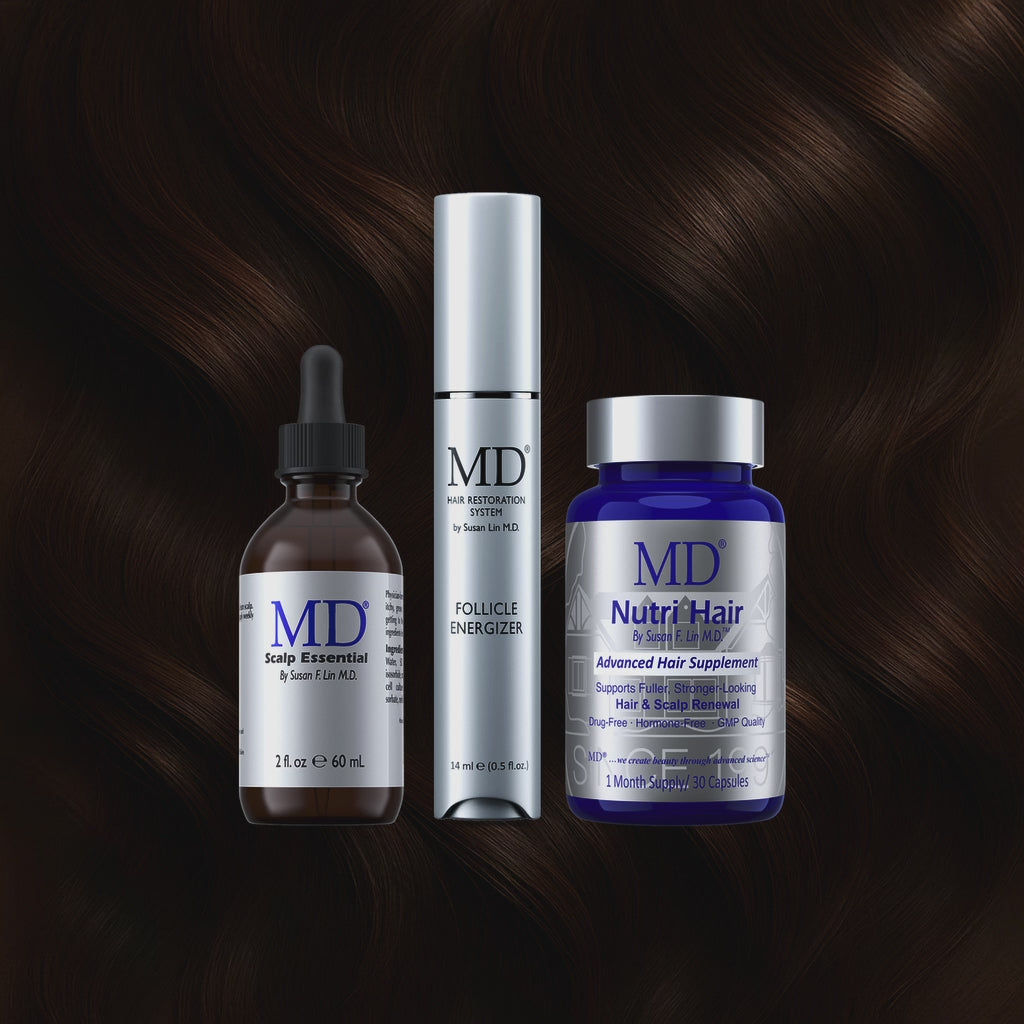 MD Hair Restoration Starter Kit – includes Nutri Hair, Follicle Energizer, Scalp Essentials, and branded box for thinning hair support